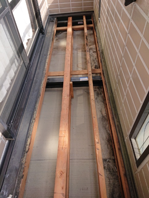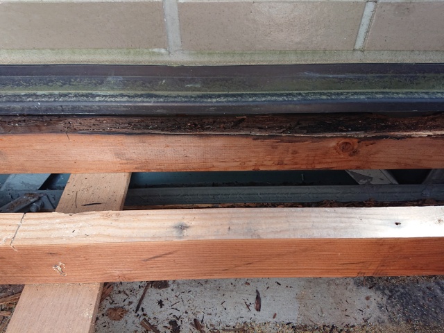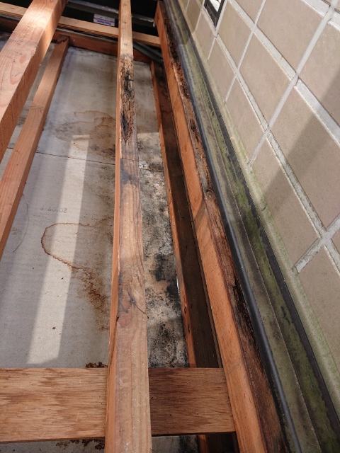建物側に排水溝があります。↓ 外側の手摺壁面下水切り部↓ 腐食がひどいです。下地合板との隙間が約5㎜程ありました。 ![]() 少しの勾配です。↓ 今回シート二重張りの水切り隙間部にシール打ちを行いました。![]() |