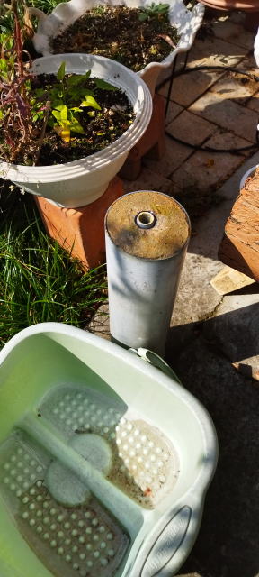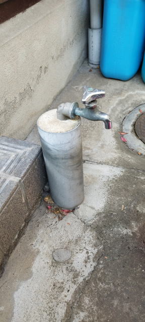 手作りで造った立水栓の水栓部分が、見事に外れて噴水状態、