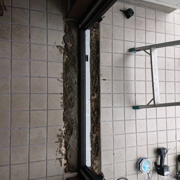 既設タイルを慎重にめくり現状の段差の確保による