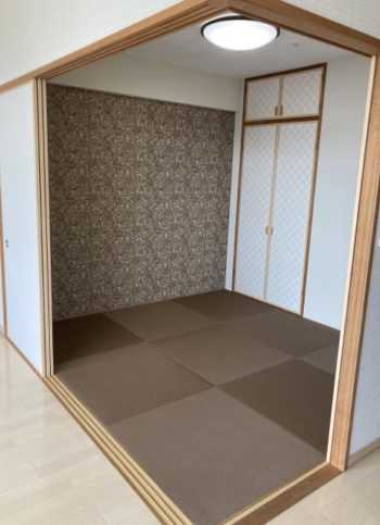 和室は一面だけ柄物のアクセントウォールシンプルな壁にちょっと変化をつけて雰囲気を変えました。