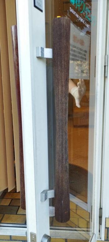 玄関扉の木製取手が、長年の太陽光や風雨で色が落ちてきました。