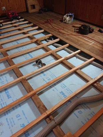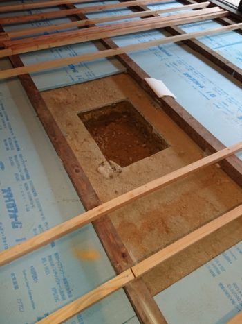 | 大引き、根太を新しく入替 断熱材敷。土間開口部が床下換気扇を納めるスペースの確保です。 |