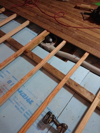 工事前の既設の床板めくり画像です。床下の隙間がありません。 土間に大引き敷と根太の床組みです。 |