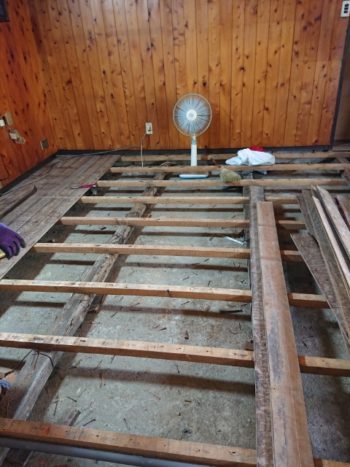 工事前の既設の床板めくり画像です。床下の隙間がありません。 土間に大引き敷と根太の床組みです。 |