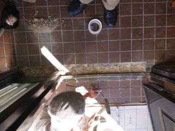 まず本日は、土間タイルの再利用によるタイルはがし工事です。