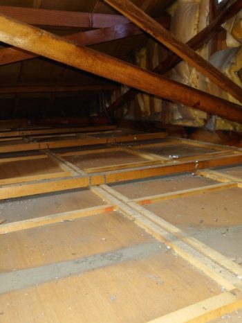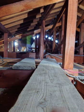 | 歩み板により奥から既設断熱材の撤去です。 かなり断熱材も傷んでいました。 |