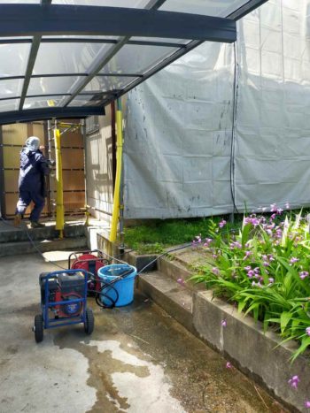 足場組立・高圧洗浄(長年の汚れ)除去します。