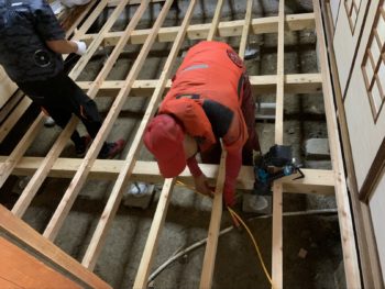 床下地受け束木から、鋼製束金物に変更、大引き、根太材、