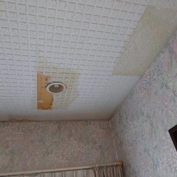 | 1階リビング天井 化粧ボード材のはがれ落ちです。 | 2階ベランダ掃き出しサッシ枠部 | |