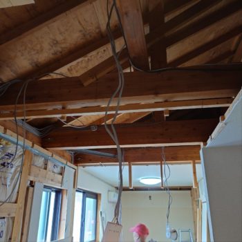 電気、水道配管埋設の為の壁材、天井材のめくり工事です。