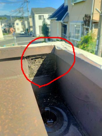 某ハウスメーカーさんの家で玄関屋根樋部分があまりよくない納まりでした。
