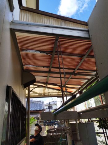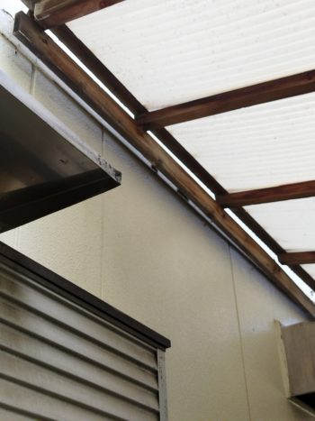 外壁より剥がれたため、アルミ製のテラス屋根に
