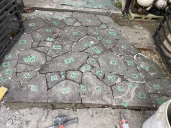 既存の鉄平石真ん中が持ち上がってきて目地にひびが入っています。