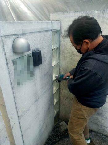 ガラスブロックも劣化で1枚破損取替作業を進め、(慎重に1枚取り除き・・!)