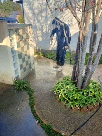 長年の汚れを塀やアプローチを洗浄して最終塀廻りをお化粧して行きます。