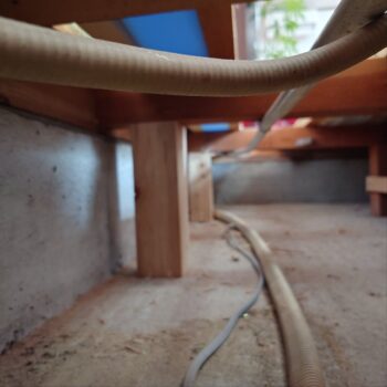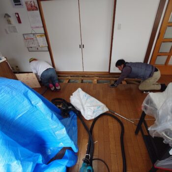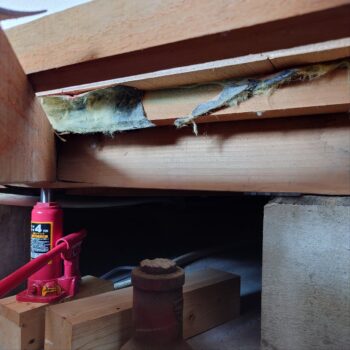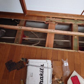 | 一部床が下がっているところがありましたので、ジャッキアップにて床下束補強を行いました。 | 約4mの間で1センチほどの床レベルの違いがありました。 | |