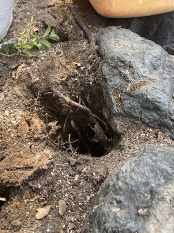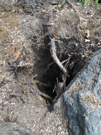 柱を立てるための穴を掘ると根っこが邪魔をします。