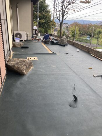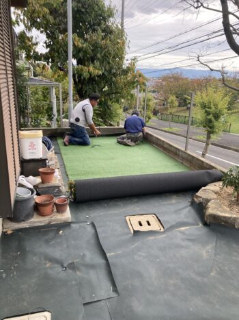 防草シートを敷いて人工芝を敷き詰めました。