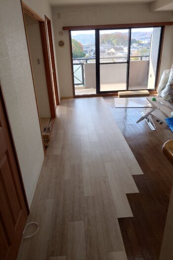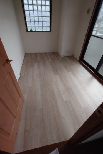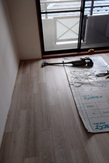 まず床からの1.5mmの厚みの床材重ね張りを行っています。