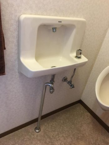 既存の小便器を撤去して 給水・排水を新しい小便器に合わせて配管やり直し壁補修です。