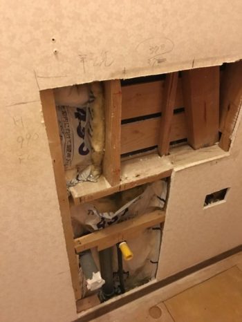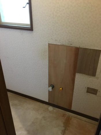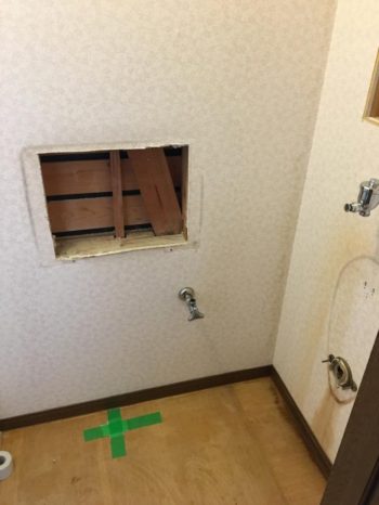 もともと埋め込み式の手洗器も撤去し位置も少々ずらして壁の補修です。
