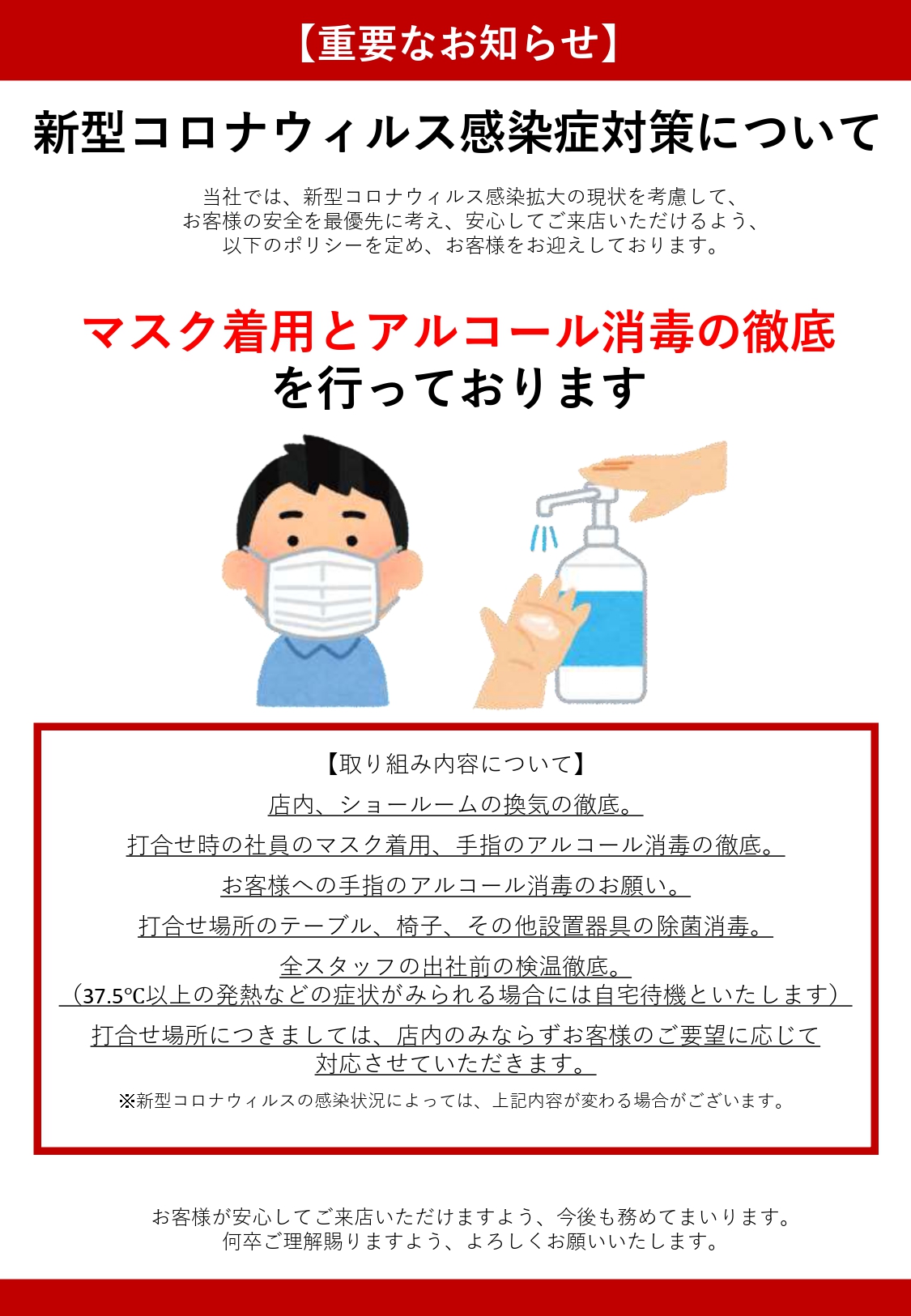お問い合わせ イベント 無料見積り・相談 電話で見積り・相談 0120-015-776 【受付】9:00~17:30【定休日】毎週水曜日、木曜日 電話で見積り・相談 HOMEイベント・チラシ・教室情報新型コロナウィルス感染予防に対する弊社対策について 新型コロナウィルス感染予防に対する弊社対策について 【ショウルームご来店について】当面の間、ご新規様のご来店に関しまして予約制とさせていただきます。事前にお電話、WEBにてご予約下さいませ。
