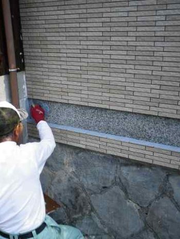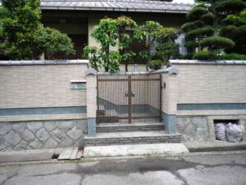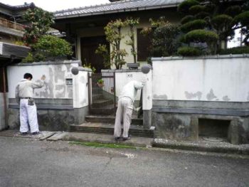 | お客様のご要望 | 築30年近く経つ、塗装仕上げの塀。白っぽい色で、これまでは汚れるたびに、ご主人様がペンキを塗ってキレイにしてこられましたが、年々大変になってきたので、あまり汚れが目立たなくて、メンテナンスもあまりいらない材料で仕上げを考えて欲しいとのことからタイル貼り仕上げの塀の改修工事となりました。 |