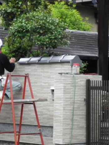 タイル工事完成後、瓦屋さんに笠木のガンブリ瓦を葺いてもらいます。