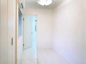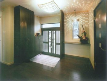 下駄箱の中に換気扇を設けて。湿気や臭いに配慮しました。また、玄関横に納戸を設置することでブーツや季節の小物などがスッキリ収納できます。和室の押入れは、反対の部屋からも物が出し入れできるように工夫しました。奥様の部屋は白を基調としたスパンコール壁のクロス貼りで仕上げました。担当:谷