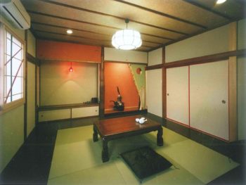 奥様のアイデアで遊び心を沢山取り入れ古きを残しつつもモダンな和室に仕上げました。床の間正面ジュラク壁を朱赤にし、左官屋さんのアイデアでもみじを貼付けてポイントにしたり大工さんが探してきた茶室に使われる椿とムロの木を使い自然なカーブを活かしセンスよく配置したりで工夫を凝らしました。赤い硝子の照明器具がよく合っています。障子のデザイン・引き手に至るまで奥様のこだわりが随所見受けられます。